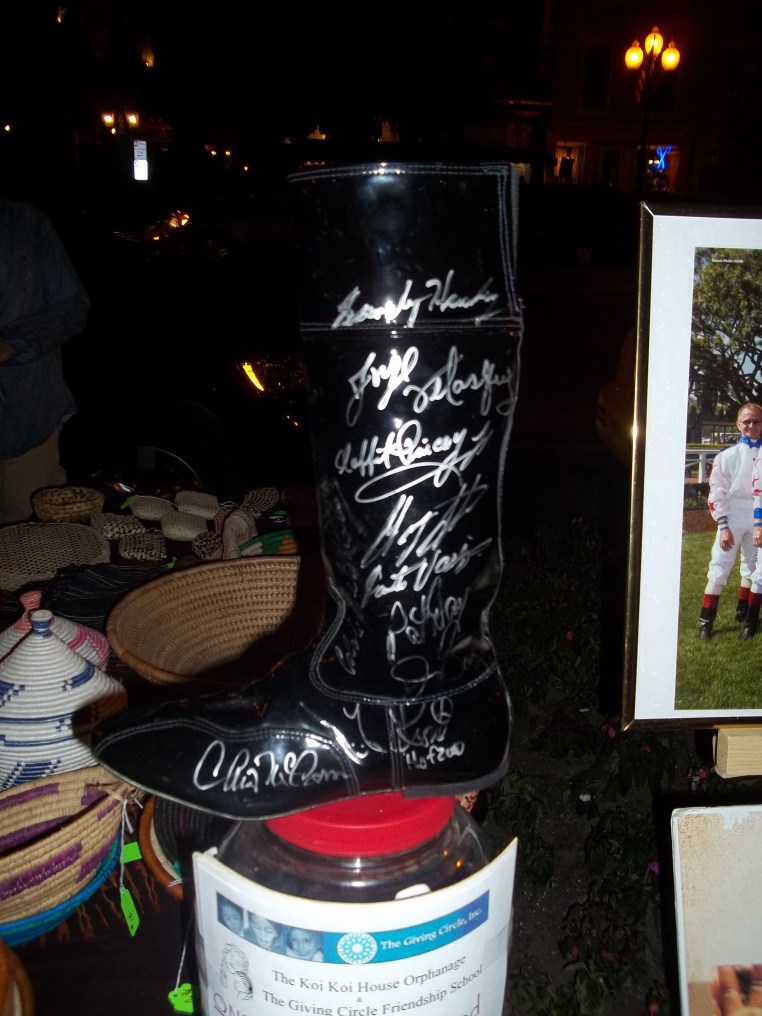 Saratoga, July 2012 18 Tuesday Dec 2012 Original size at 3216 × 4288 ≈ Leave a comment Jockey boot signed by Julie Krone and other greats, being raffled off. I won the raffle, and this boot is now in my living room.
