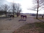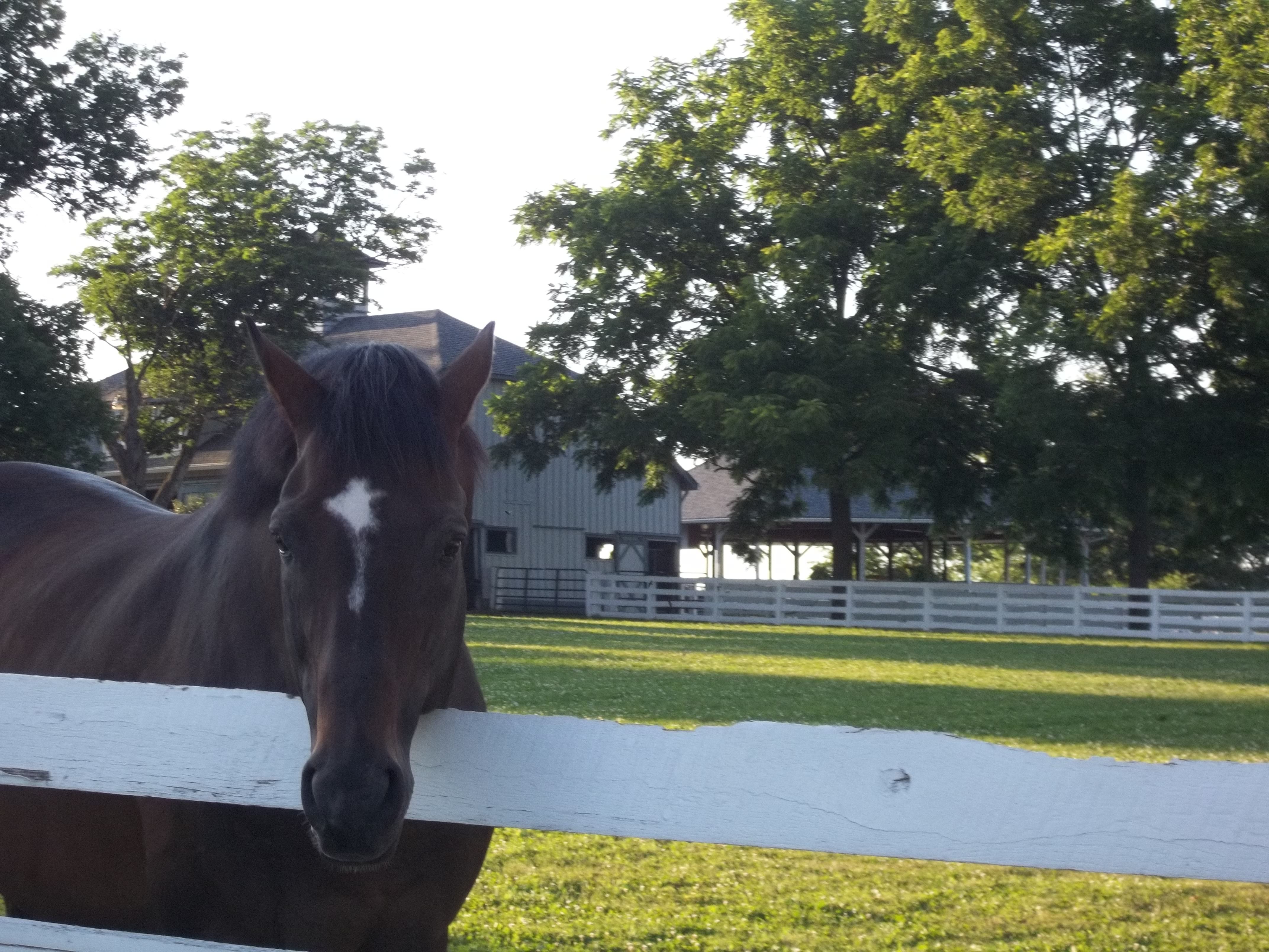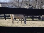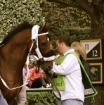 One of the horses that had been schooling grazed at a nearby barn, between impatient attempts to go into the shedrow. When he had been schooled earlier, I saw that energy channeled into pirouettes in the paddock—perhaps a sense of the races to come that transmits itself to the horses and to the crowd.