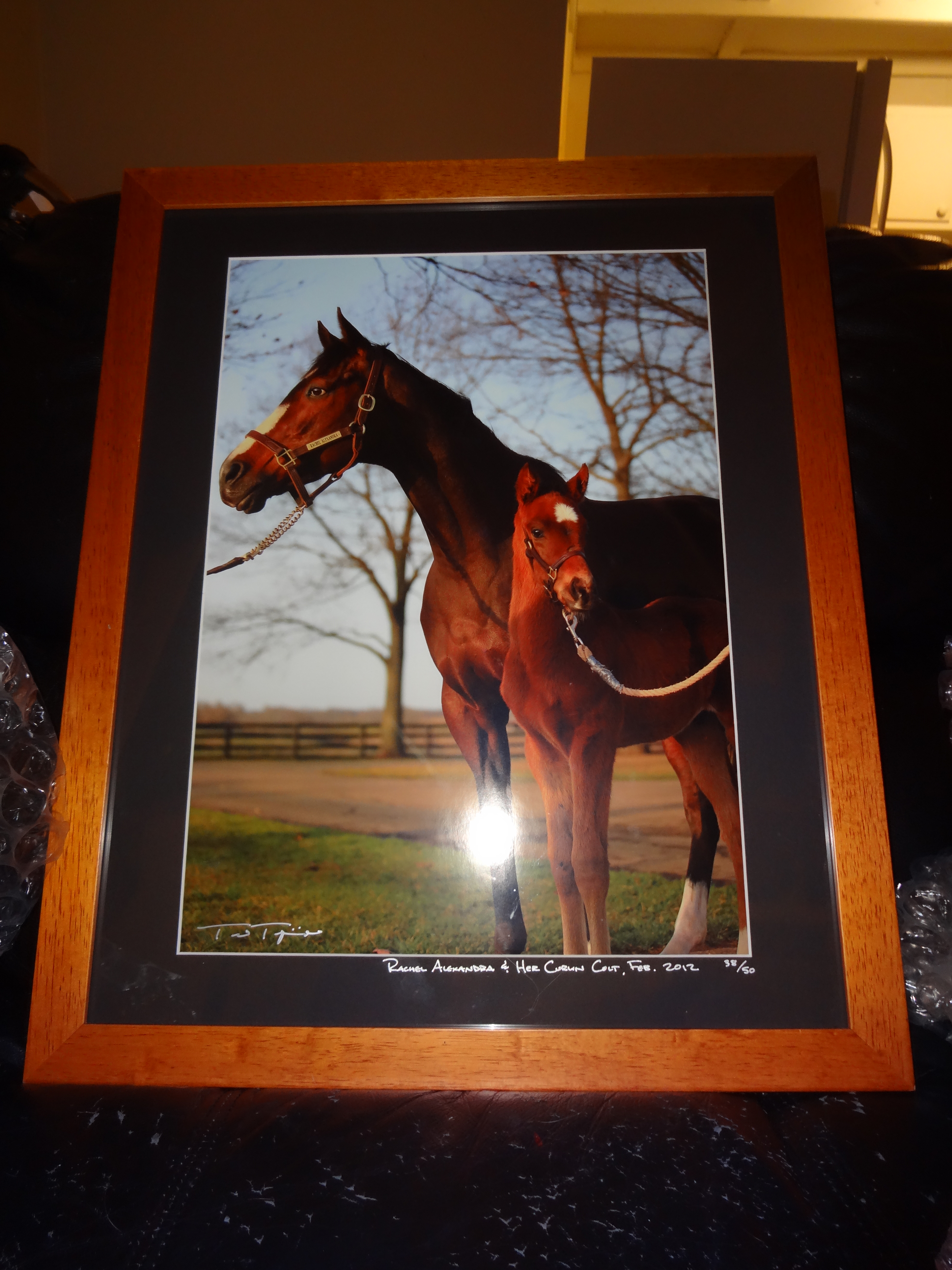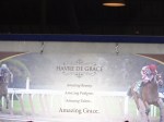 Groupie Doll was my first pick and excitement flowed to a crescendo as I watched her enter the walking ring, calm and focused. The excitement increased exponentially as the post time for her race, the Thoroughbred Club of America Stakes, drew nearer, and then they began their surge down the track. Groupie Doll sat behind the leaders patiently as announcer Kurt Becker intoned, “Groupie Doll… needs running room and is looking for it, inside, outside, can’t find it yet…” and I held my breath to see if she’d get clear. A path parted for her just in time; she grabbed the lead in a blink and never gave it back, demolishing the field behind her in a thrilling tour-de-force. In the winner’s circle, jockey Rajiv Maragh said he knew she’d win when she got a clear path, and she was just waiting for him to say go… an unwavering faith in this remarkable filly that echoed my own. For me, it was born on a day I got to make her acquaintance at the barn, and she licked my hands. Love can grow out of the simplest things. I was also told that day nearly a year ago that she was going to be the next champion: a potential realized and a belief handsomely rewarded on this day. It is for the connection like this, more than betting or even winning, that has drawn me to the track again and again.
