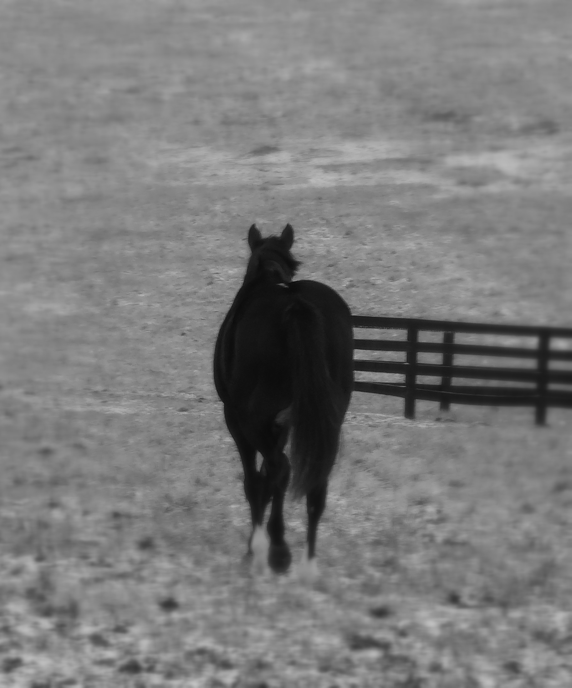 She was turned out shortly after, the first time I’ve seen her turned out, and she neighed once commandingly on the way to the paddock, then was silent. She first just walked around and the other mares in the field began to come towards her in single file. When she reached a further end of the paddock, she began to run briefly, tail held high.