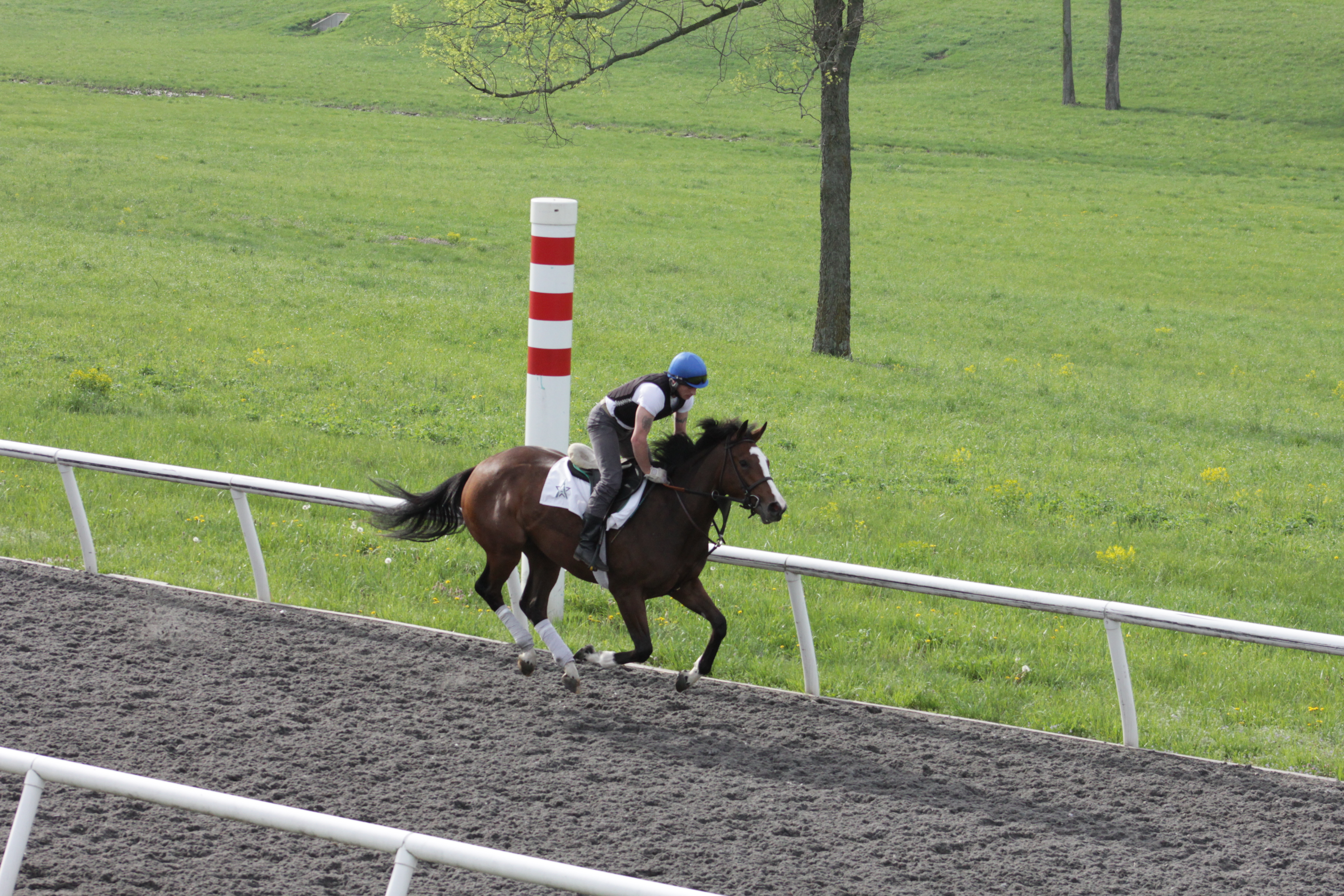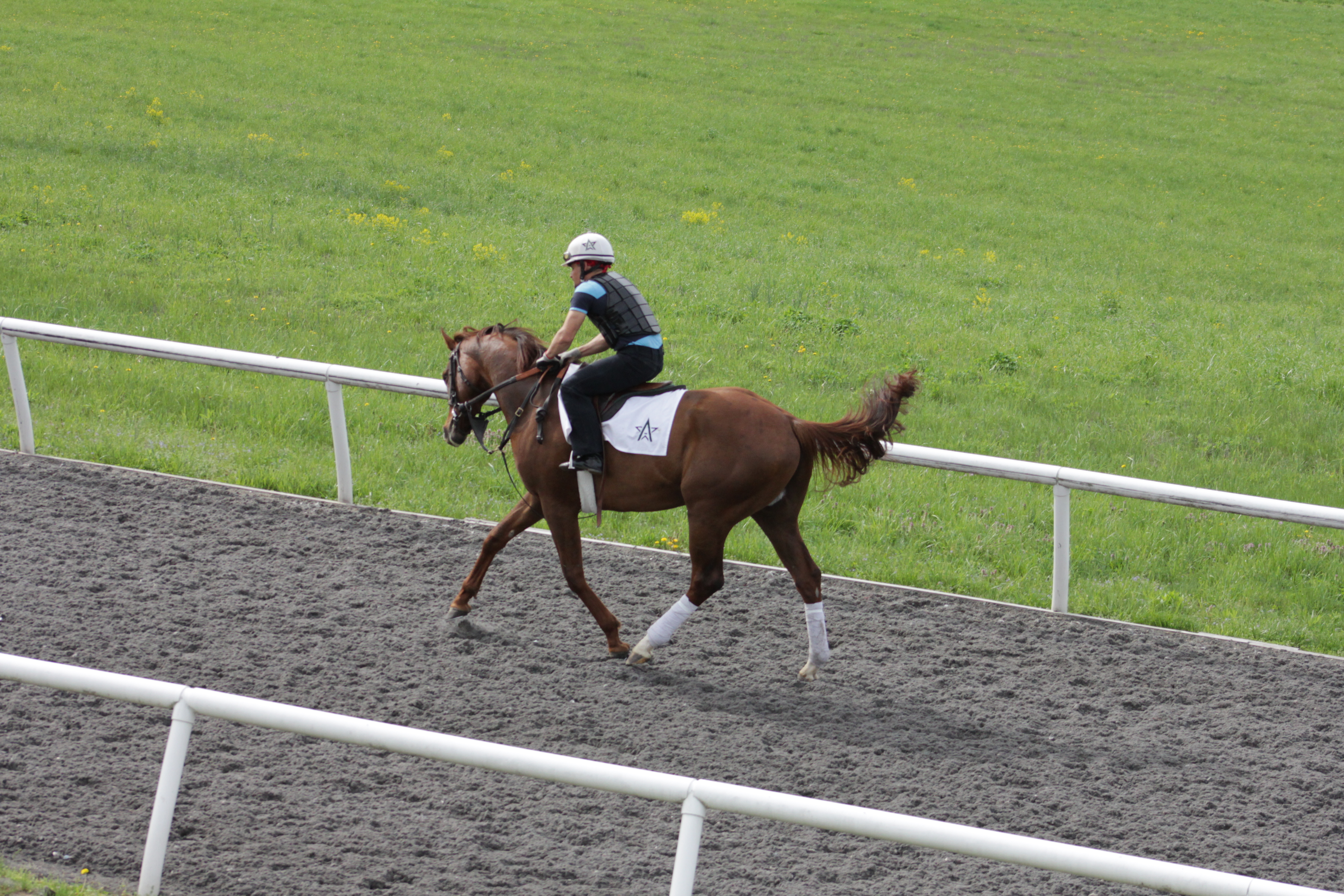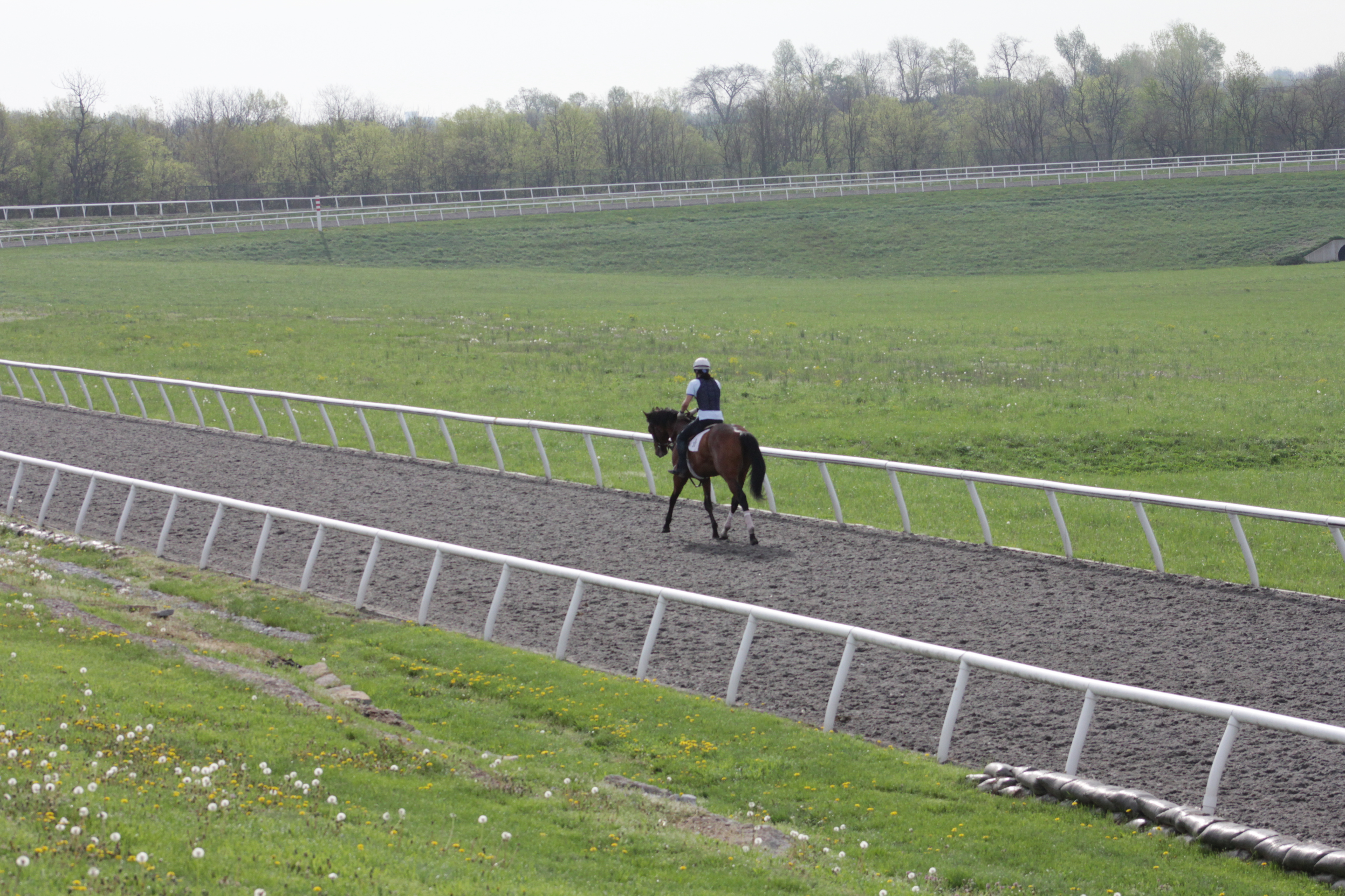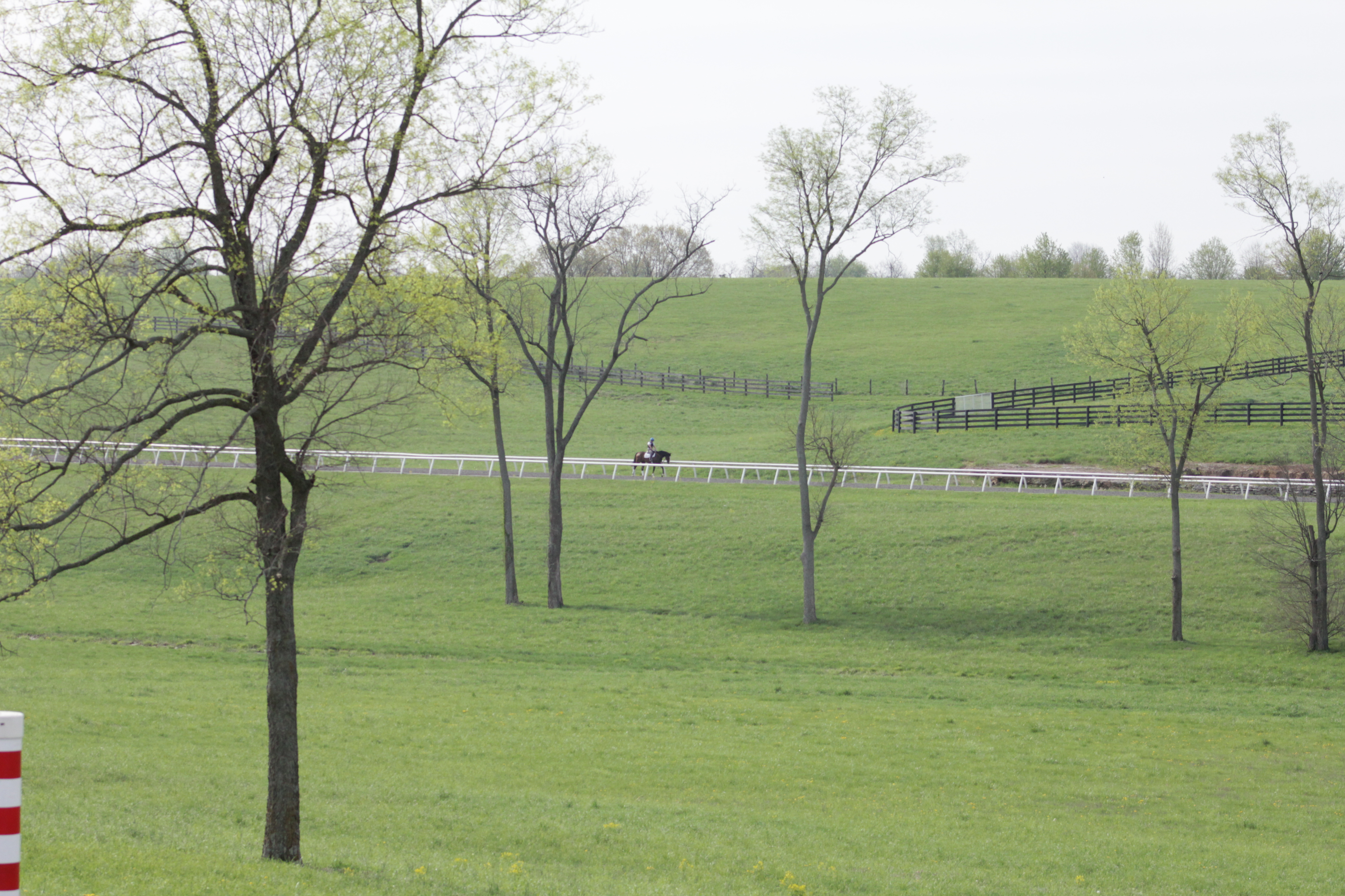 We had been joined by farm owner Elliott Walden when we were being told about the pool, and he walked down to the training track with us. This is an exciting time for Winstar. It’s not surprising, considering the depth of their stallion roster and all the work they put training homebreds and purchased horses that they have two serious and legitimate Kentucky Derby contenders with farm ties this year. Naturally, though that would still be incredible for any farm. Primarily West Coast-based American Pharoah is by their stallion Pioneer Ofthe Nile, and they own Carpe Diem in partnership with Stonestreet Farms. Carpe Diem has already made a large mark on the current Keeneland meet, winning the Blue Grass Stakes on opening weekend, and being accorded near rock-star status the morning we visited the farm. Keeneland harrowed the track and closed it to all horses but Carpe Diem that morning for him to train at 10:15, when he zipped through four furlongs in 48 seconds flat, a work watched by trainer Todd Pletcher, Elliott Walden, and quite a few spectators who applauded his entrance to the track to work. I would have liked to go over and see his work, but my friend saw him and got photos.