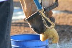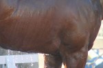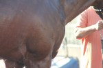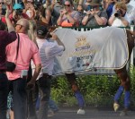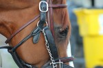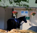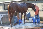 Following him back to the barn for his bath, he stood calmly, while nearby Sunny stuck his nose in a bucket of water and lifted the sponge in it out with his teeth. He appeared to have a bit of a playful demeanor now that he was done accompanying Justify to the track, trying to grab at the towel used to dry him after his bath, and toying with his lead shank.