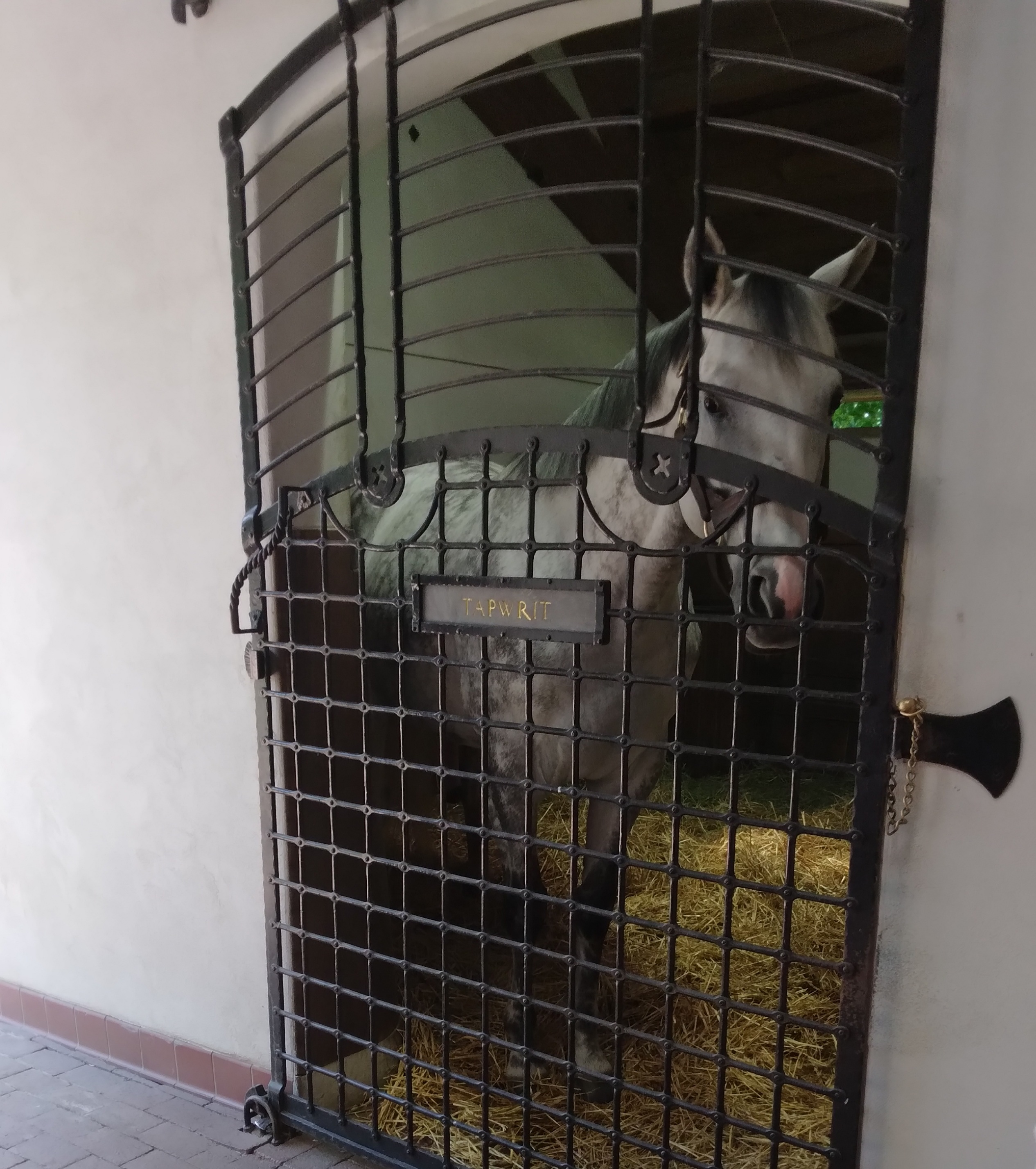 The visit wrapped up at the circular mare and foal barn, which had once been a dairy barn, and where I had never gone before. The guide hoped to show us mares and foals up close but they were all at the far end of the pasture, the lure of the grass there apparently too strong!