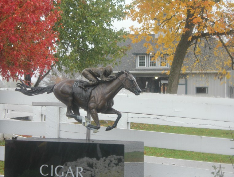 28 Wednesday Oct 2015 Original size at 3035 × 2309 ≈ Leave a comment Fall colors and a new statue at the fence line where Cigar once reigned